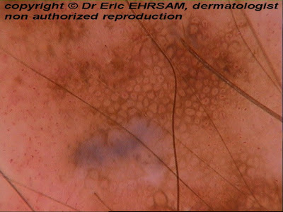 Dermoscopy (x20) showed a combination of two patterns:1-on the left: an homogenous pattern with comma vessels