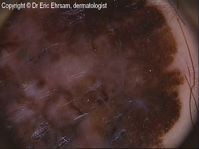 This case concerned a 59-year-old patient: this pigmented lesion of his right thigh was discovered during a consultation for condylomas. The patient was not conscious of this lesion.On dermoscopy (x 20) : Multicomponent pattern, irregular pigment network, blue white veil very irregular, irregular streaks (bottom) irregular dots and globules.